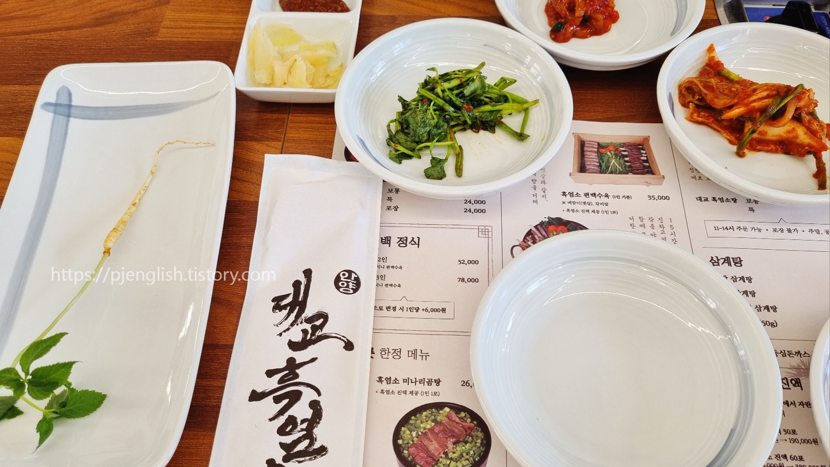 흑염소갈빗살이 들어간 탕요리를 주문하였는데, 왼쪽에 보이는 이름 모를 삼 보이나요? 식전 애피타이저나 고급스러운 삼이 나옵니다.