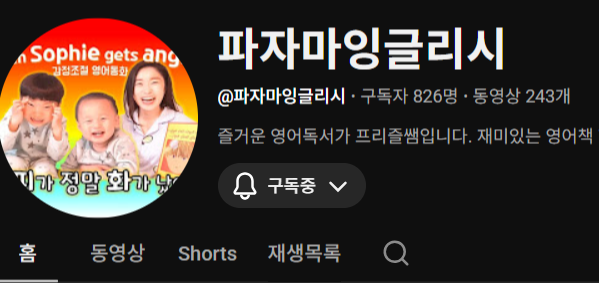 엄마표영어 유튜브 영어교육 채널로 오늘 기준으로 구독자 826명, 동영상은 243개 게시되어 있다.