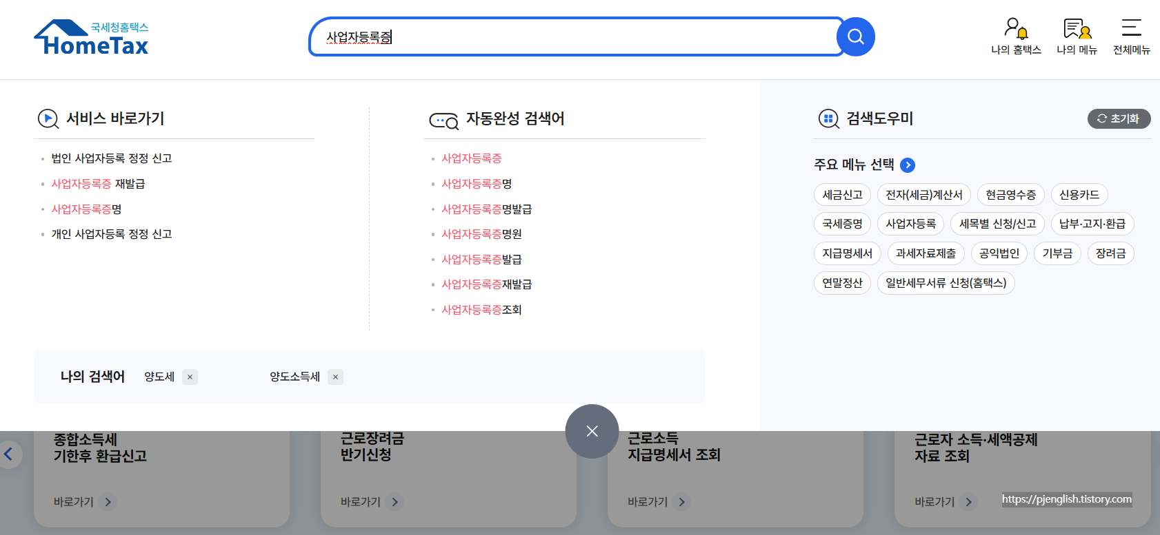 상단 중앙에 보이는 검색창에 '사업자등록증'이라고 입력합니다.