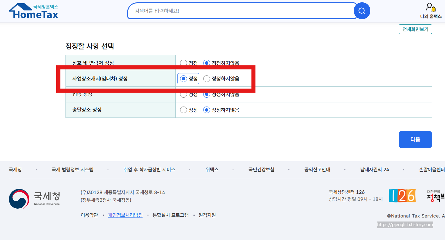 정정할 사항에서 '사업장소재지 정정' 항목에서 '정정'을 체크 후 다음 단계로 넘어갑니다.